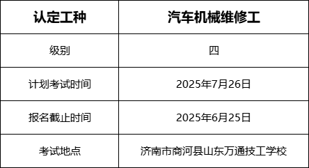 山东万通技工学校有限公司计划于2025年7月开展汽车机械维修工四级职业技能等级认定,现将考试计划公布如下: